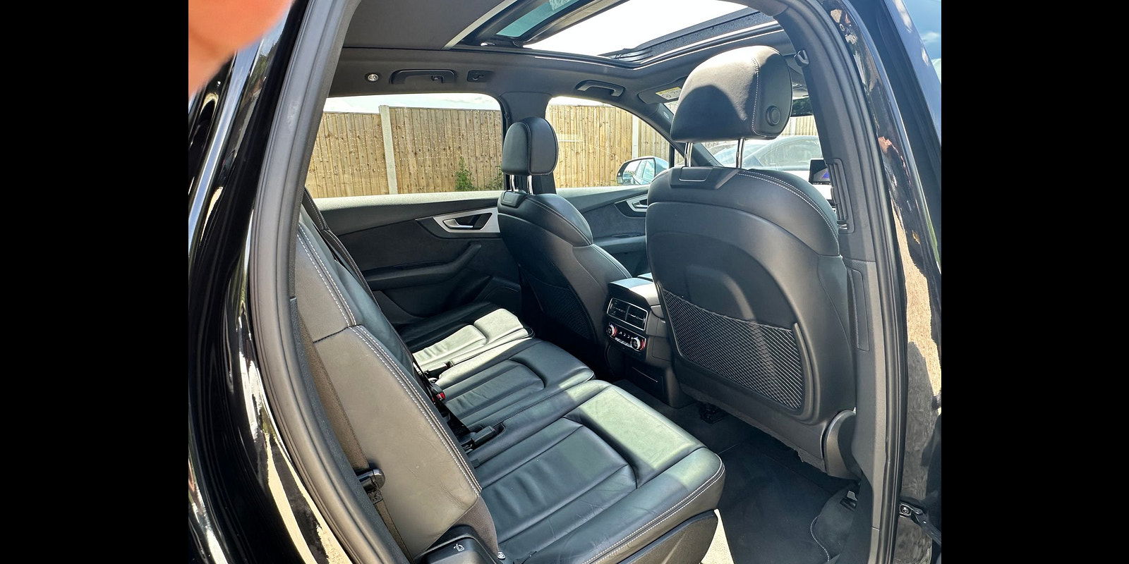 The striking Audi Q7 is a statement of luxury and performance, beautifully presented in a sleek, deep black finish. Its powerful stance is accentuated by the signature Singleframe grille, dynamic LED headlights, and bold wheel arches that provide an assertive look while housing stunning 21-inch alloy wheels. The aerodynamic silhouette not only turns heads but also enhances efficiency, ensuring that you'll make an impression wherever you go.