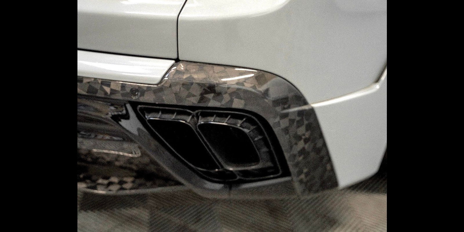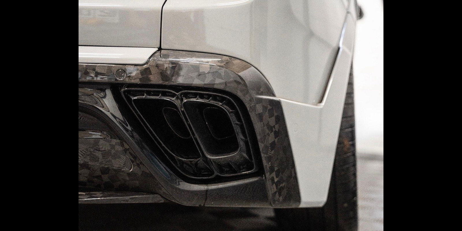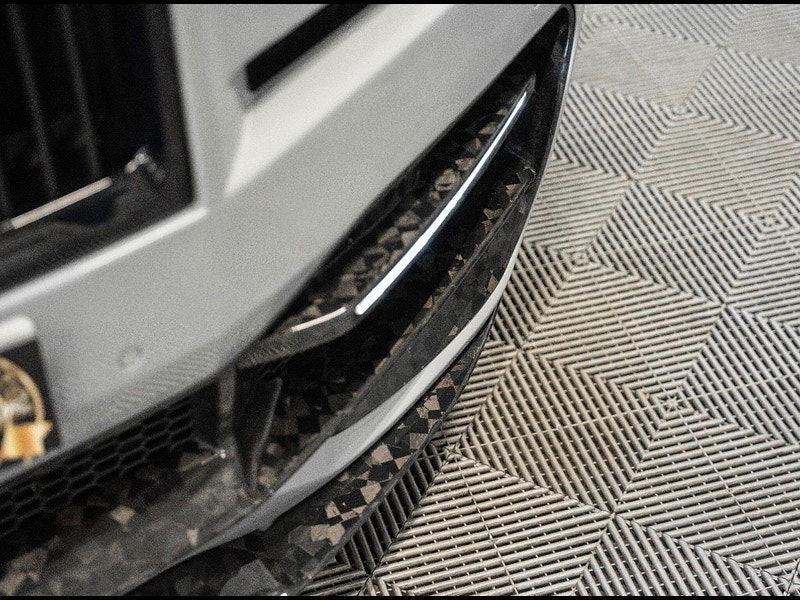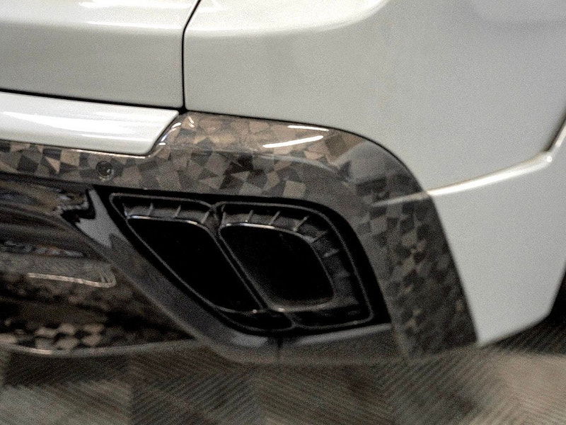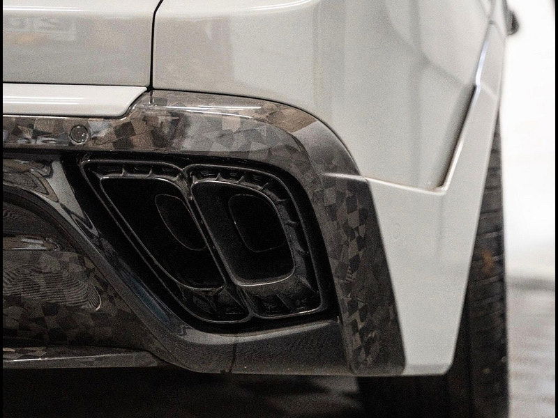 Details of the Onyx Concept enhancements are outlined next: Full Carbon Fibre Exterior Body kit Which Includes Complete Front Bumper Incorporating Daytime Running Lights Alongside Exposed Forged Carbon Lower Splitter, Extended Wheel Arches, 24" Forged Wheels With Self-Levelling Wheel Centres With Forge Yellow Pinstripe, Extended Side Panels With Exposed Forged Carbon Side Blade, Exposed Forged Carbon Extended Roof Spoiler, Exposed Forged Carbon Tailgate Spoiler, Complete Rear Bumper With Diffuser Housing Machined Aluminium Tailpipes And Exposed Forged Carbon Rear Blade, Full Exterior Branding Pack And Full Exterior Colour Code To Brightwork That Covers Front Grille, Window Surrounds, Door Handles And Rear Tailgate Trim.
