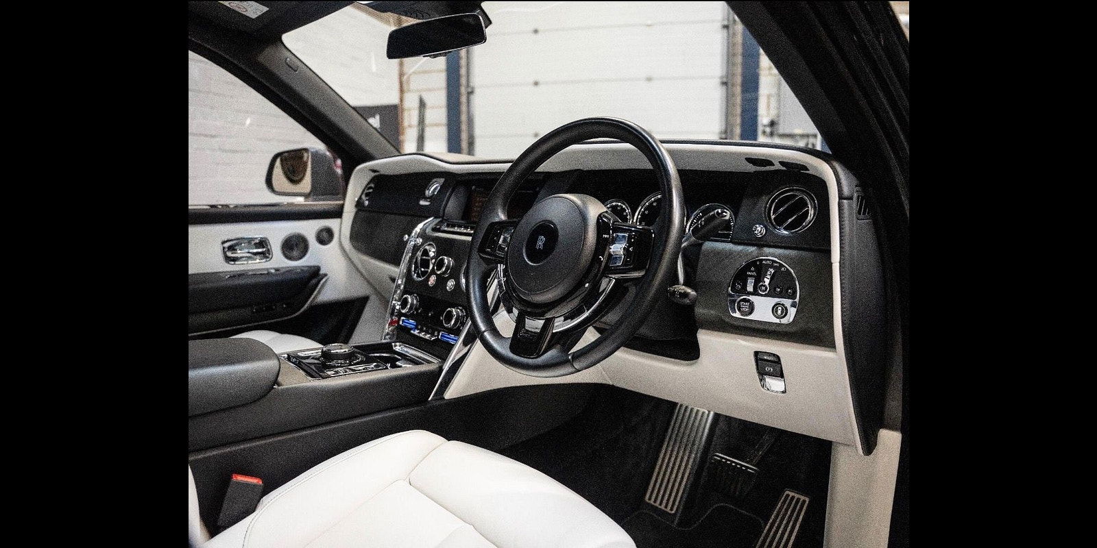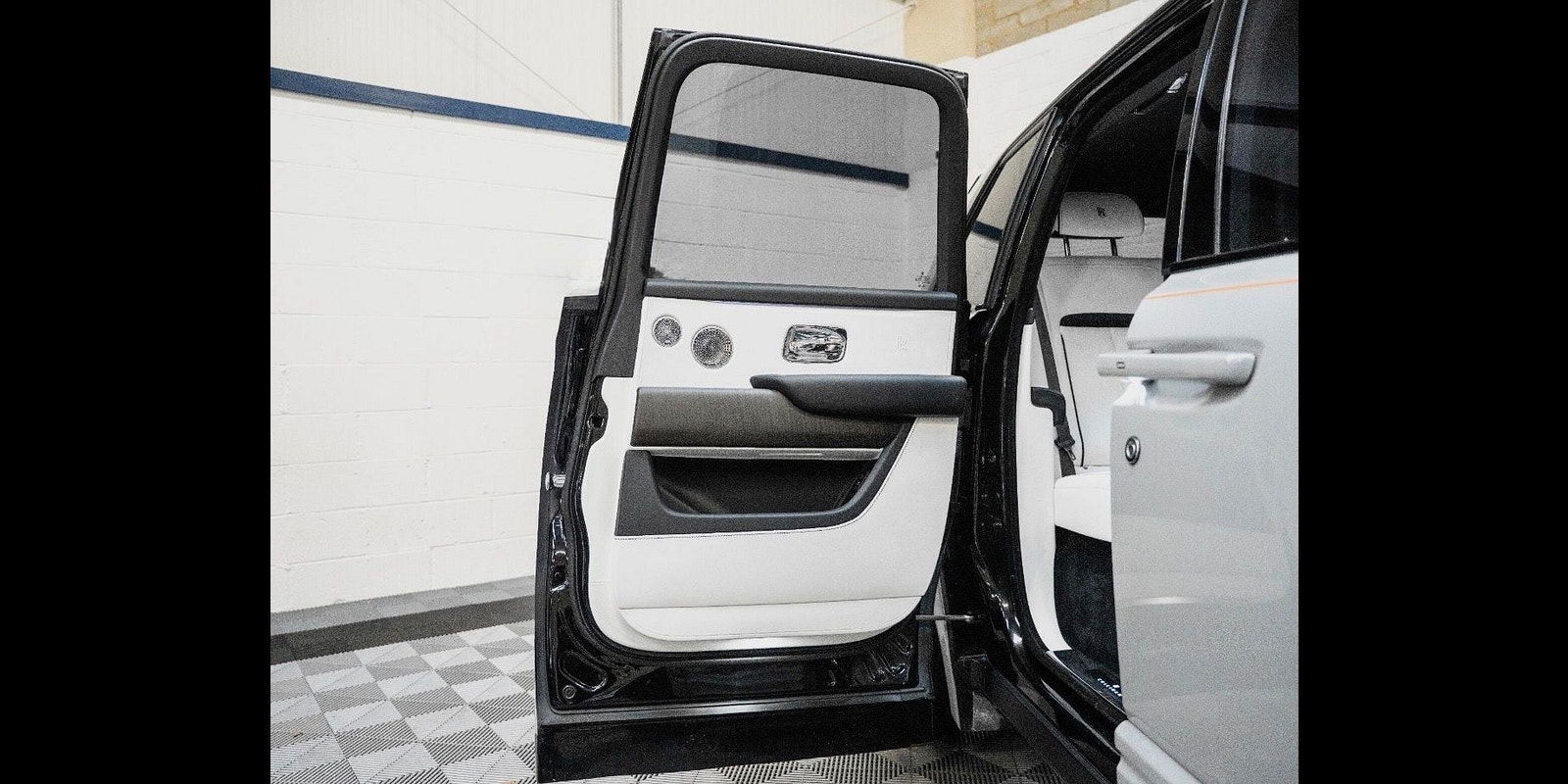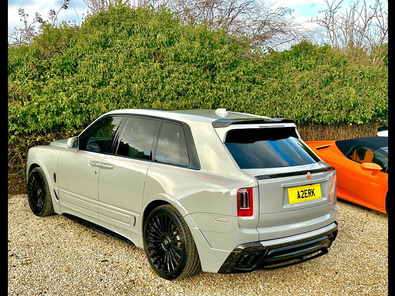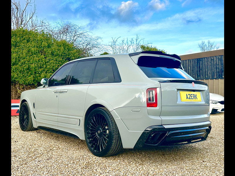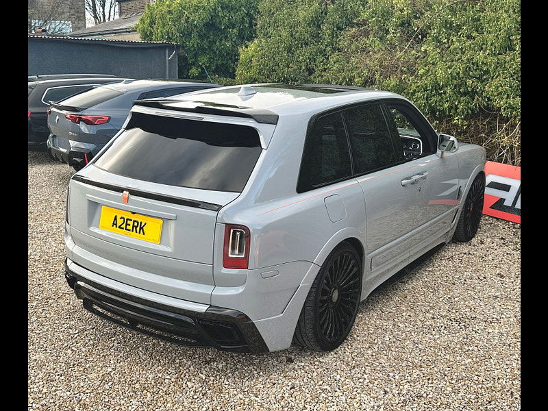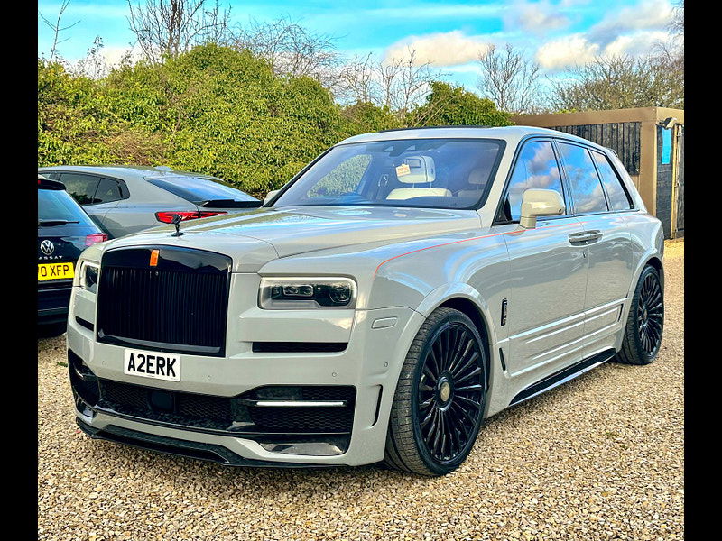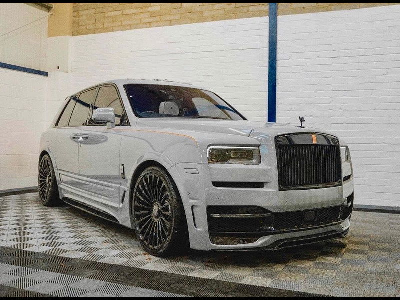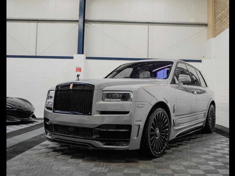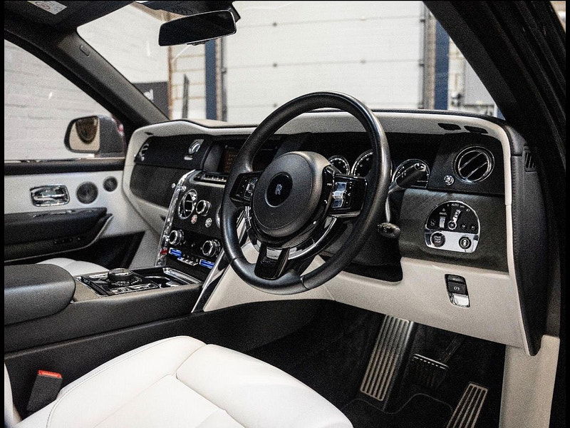 Finished in Black Diamond Metallic with Arctic White Leather, the exterior is currently wrapped in a high gloss Nardo Grey film that can be easily removed if preferred. The vehicle is presented with a high Rolls-Royce factory specification that includes Panoramic Glass Roof + Head up display + RR Bespoke Audio + Rear entertainment theatre package + Driver Assistance Systems inc active cruise control + and the launch specification Cullinan Pack